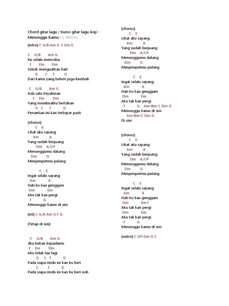 C g am g f em g. Chord menuggu kamu lagu dari anji mudah banget chordnya, semoga teman teman pahamlirik menunggu kamu'ku selalu mencoba untuk menguatkan . Chord dan kunci gitar menunggu kamu anji. Chord kunci gitar menunggu kamu anji lirik lagu intro : Anji intro c g am g f c g verse c g am g ku selalu mencoba f em dm untuk menguatkan hati . Capo di fret 2 (versi video). F em dm untuk menguatkan hati g c f g dari kamu yang belum juga kembali. intro g d em d c g d. C g am g ku selalu mencoba. Anji ~ menunggu kamu (intro) c g am g f c g c g am g ku selalu mencoba. Layanan mobile dari situs entertainment terbesar indonesia, kapanlagi.com. Em c f g dari kamu yang belum juga kembali Lagu menunggu kamu adalah buah karya erdian aji prihartanto alias anji.